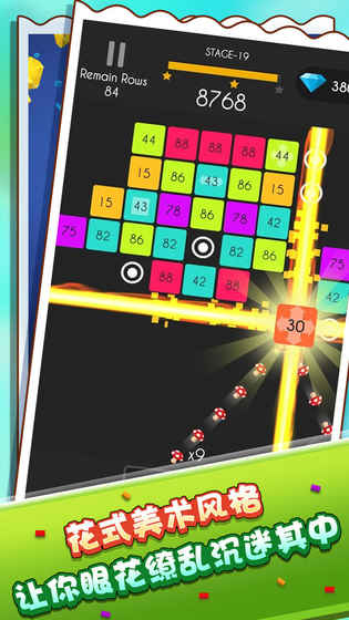 物理弹球:按住屏幕水平拖动手指,调整射击方向,瞄准目标后放手发射所有等待中的弹球,轻松击碎所有砖块!阻止砖块到达底端极限线;