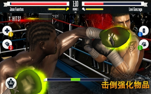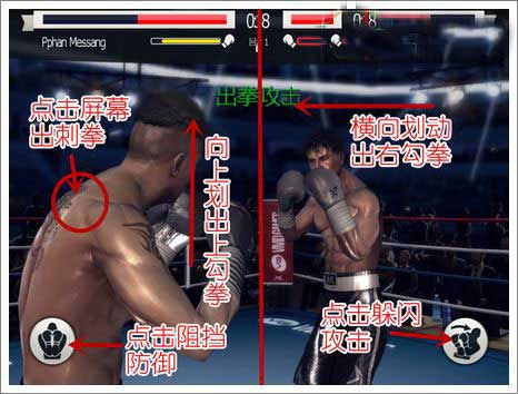 点击左侧屏幕,角色会打出左手“刺拳”;横向划动屏幕,角色则会使出“左勾拳”;从下往上划动屏幕,角色就会打出“左上勾拳”。同理,点击右侧屏幕时,角色会用右手施展出相同的招式。当我们遭到对手攻击时,可以点击阻挡或防御按钮来降低所受伤害,并抓住合适的时机进行反击。