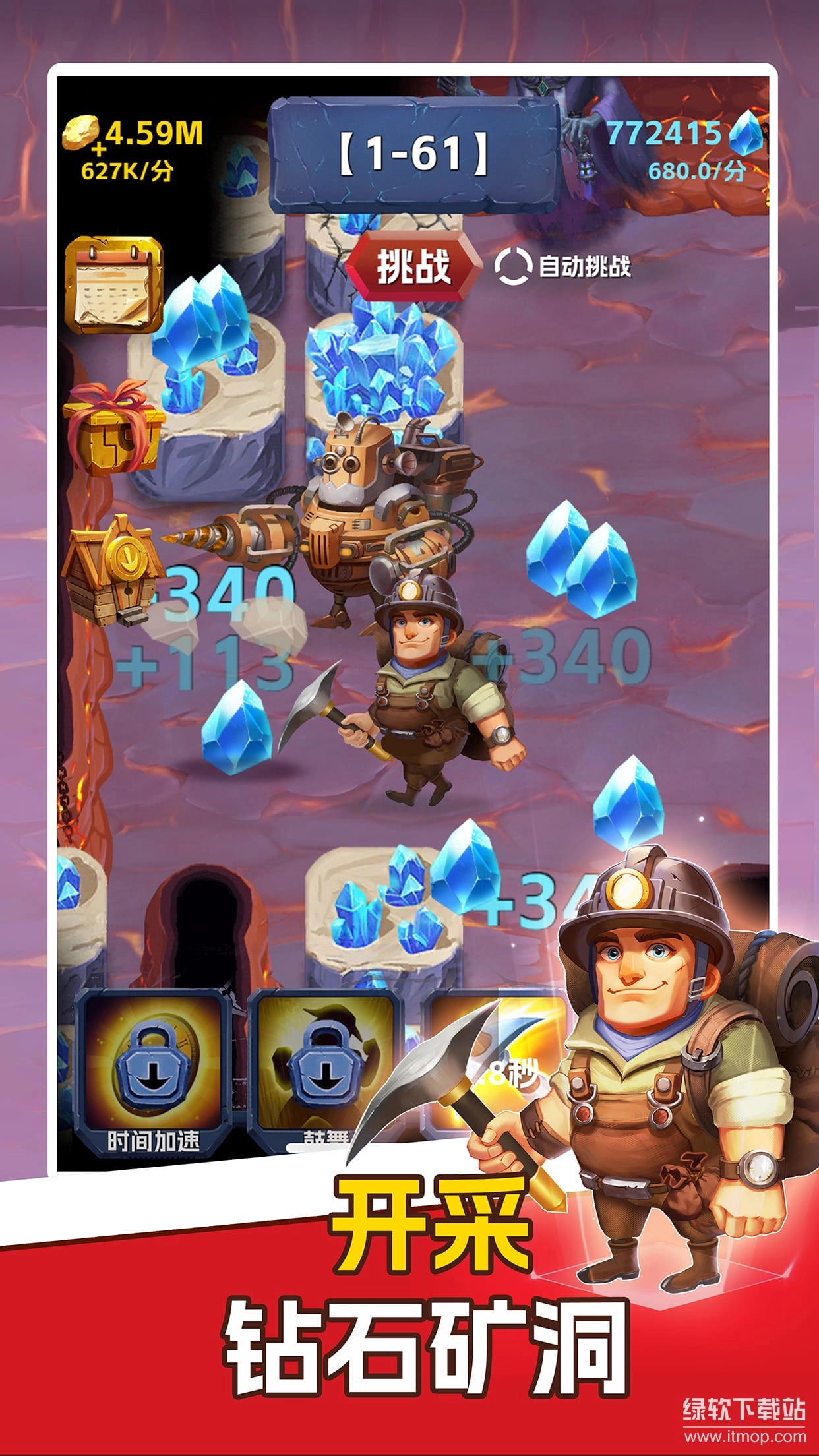 3、挖掘金子、钻石,击碎邪能水晶,升级你的主角并解锁强力技能。