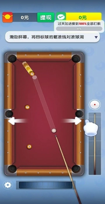 本游戏会通过文字提示你来指导你操作,让你熟悉游戏里的台球操作,你可以看到虚线来选择角度,然后拉杆选择力度去打台球,还能够看到台球被撞击后的轨迹,让你可以完美的打球入洞,比较简单。游戏关卡挑战很丰富,能够获得奖励也很多,让你可以更好的去体验游戏。