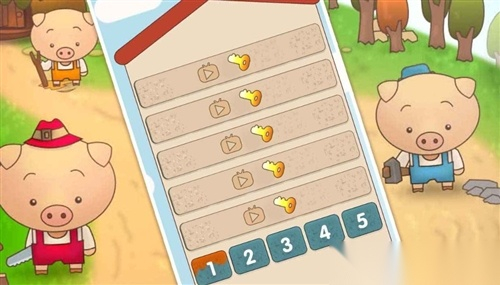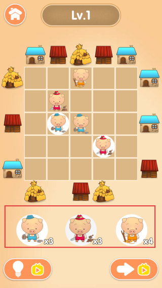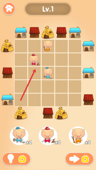 1、开启关卡:点击主界面上的黄色三角形按钮,即可进入Lv.1小猪布局的关卡。