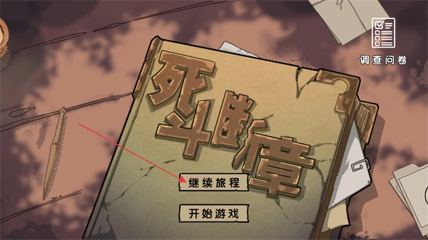 这是游戏的初始界面,界面上有“继续旅程”和“开始游戏”两个操作按钮,右上角还设有调查问卷选项。点击相应按钮,就能开启新的游戏进程或恢复之前的游戏进度。