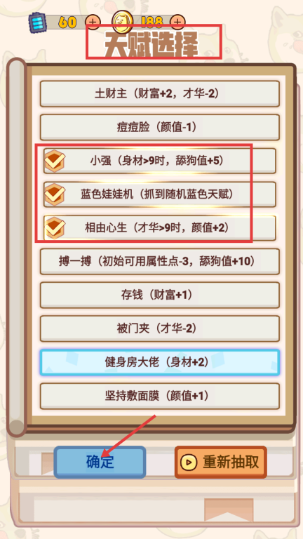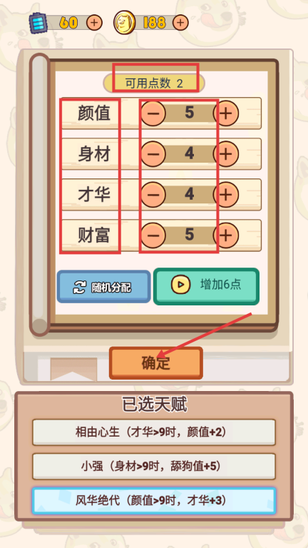 2、当出现【可用点数-2】时,需结合已选天赋,针对性地将这些点数分配到【颜值】【身材】【才华】这几个属性上。比如,为了触发天赋效果,可以侧重提升与之相关的属性,调整完毕后点击【确定】按钮即可。