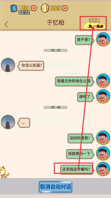 3、和于忆柏对话时,挑选类似【还用我送早餐吗?】这样的选项,不断增加【舔狗值】,注意对话选项对这个数值产生的影响。