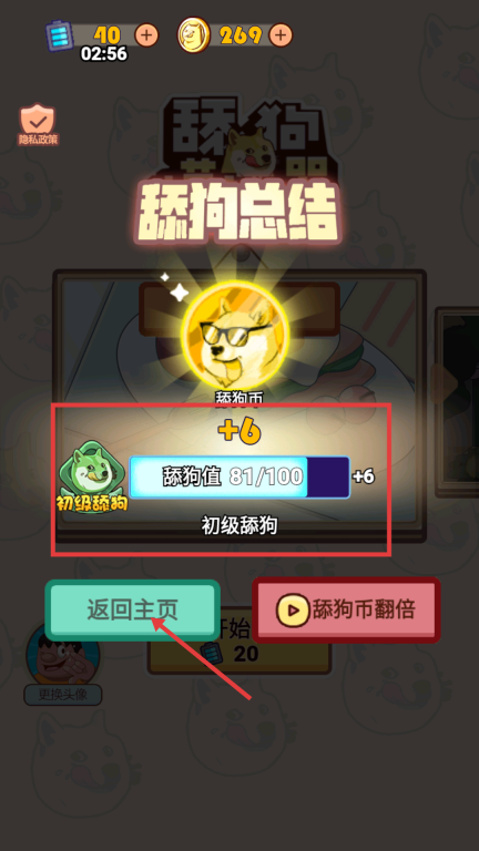 4、完成互动环节后,可查看【舔狗总结】页面,关注【舔狗值-81/100】的进度情况以及舔狗币的获取数量,之后可以选择【返回主页】,也可以通过参与舔狗币翻倍活动继续进行游戏。