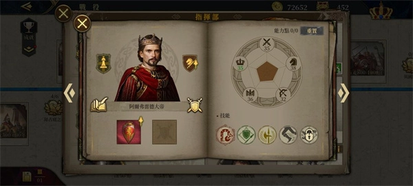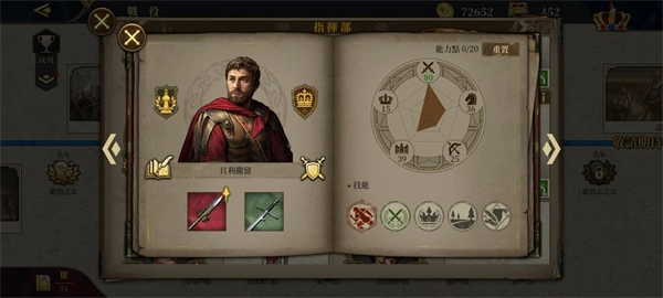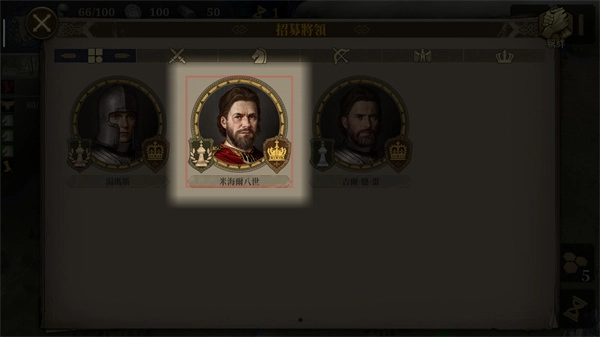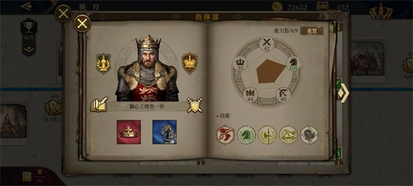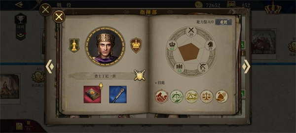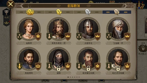 点击招募将领后,可看到将领的属性包含步兵能力、骑兵能力、弓兵能力、内政能力与士气这几项。其中内政能力的作用主要体现在两方面:一是对城市产出有加成效果,二是当将领被任命为行政官时,能为国家的外交和内政带来额外加成。将领提升军衔的过程中,不仅能获得可用于强化各项属性的能力点数(该点数可重置),还能解锁新的技能槽和士兵槽。而传奇将领则可通过提升爵位,来增强部队的伤害输出并提高减伤效果。此外,每一位传奇将领都拥有对应的英雄传奇章节和专属装备,专属装备能够对其专属兵种和技能起到加成作用。