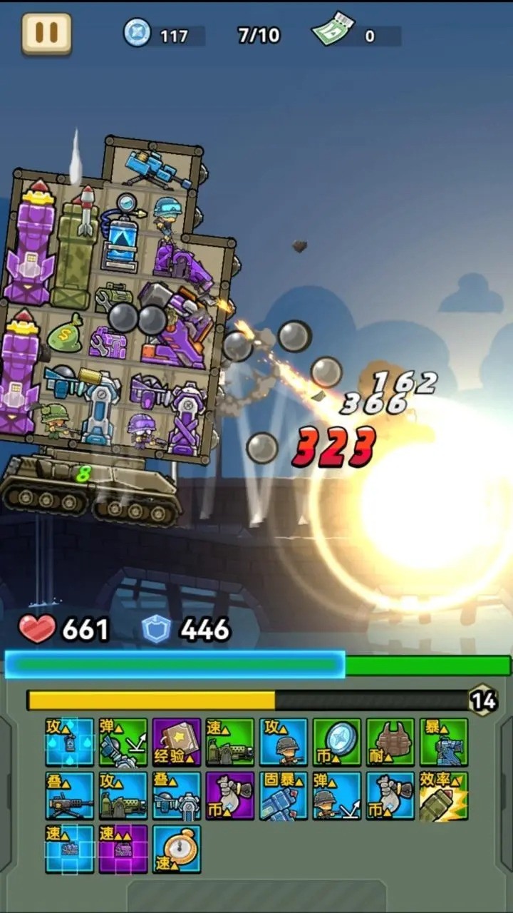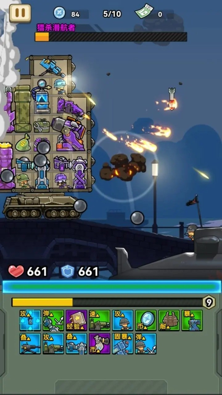 战车向前冲向敌人开炮由爱游科技开发,这款游戏设计了丰富的闯关关卡。游戏开始时,玩家会获得一辆坦克,放置好武器和士兵、做好准备后即可投入战斗。当两个相同的道具被放到一起时,就能合成一个更加强力的道具;防御塔会自动向敌人发起攻击,每一波战斗结束后,玩家都可以进行休整,再次获取格子和装备。