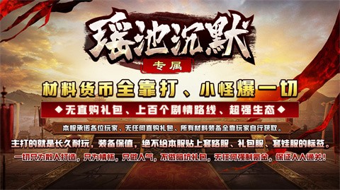 瑶池沉默专属是别具一格的沉默版本,专为散人生态打造的良心服,没有任何套路,支持码长城玩法,所有材料和货币都靠打怪获取,随时能加入精彩战斗,升级速度很快,散人只要花时间就能达到终极,重燃热血激情的岁月。