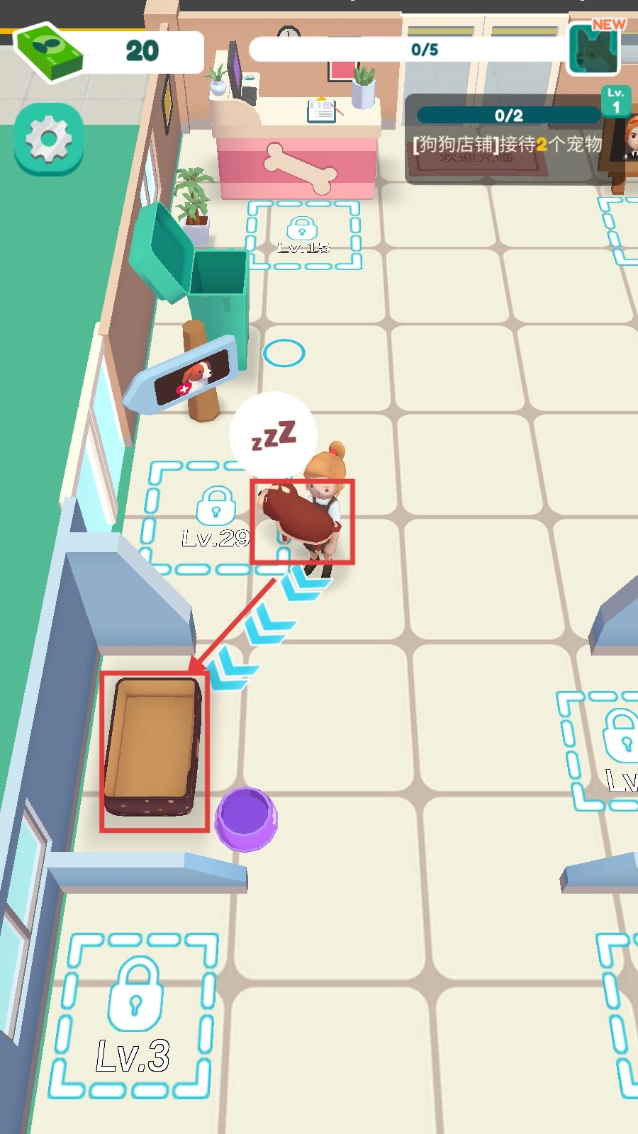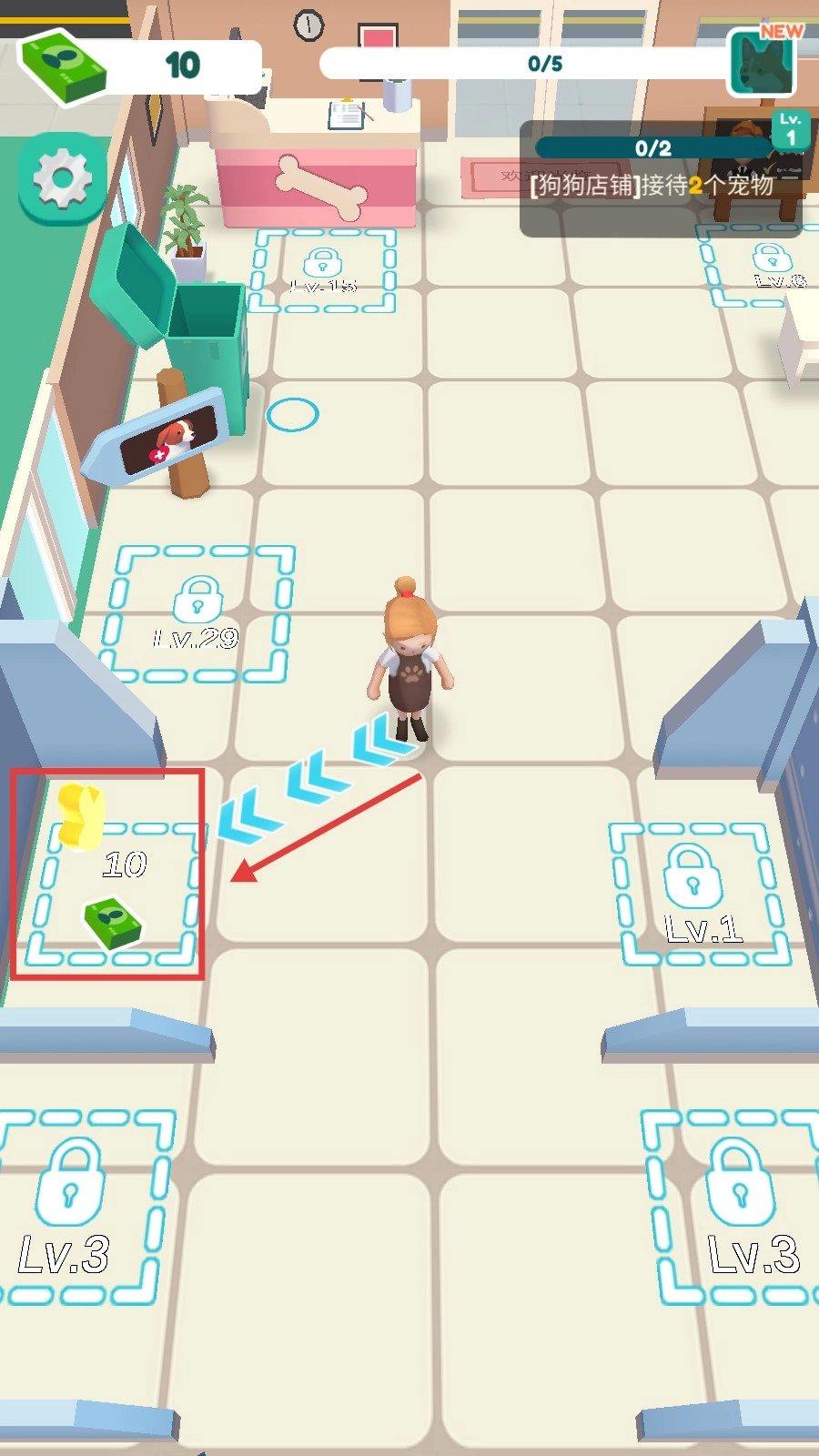 1、走进迷你宠物店,顺着箭头的指引前行,找到带有钞票标识的区域,解锁照顾区,为店铺的经营工作做好准备。
