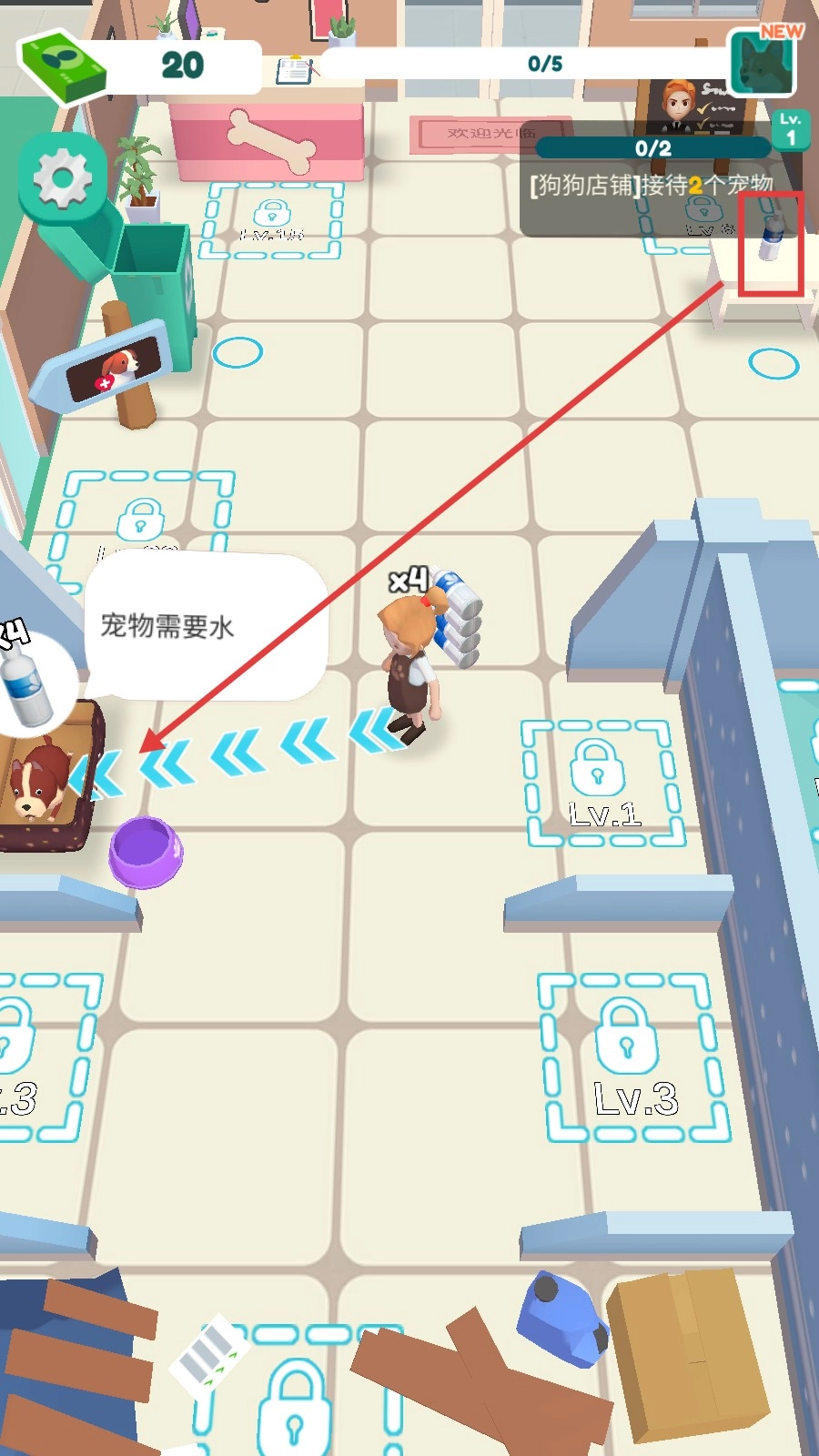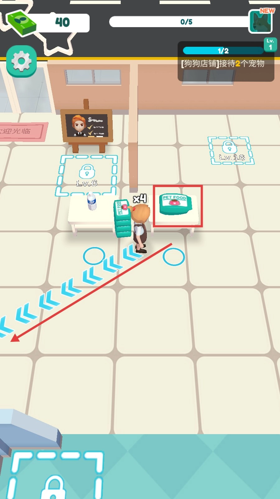4、看到宠物食品后,顺着箭头所指的方向,将食物搬运至对应的区域,为宠物喂食,以此助力店铺经营实现升级。