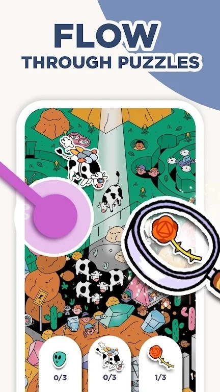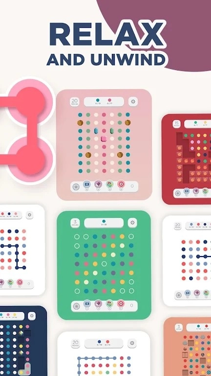 2、从基础入门教学逐步过渡到烧脑级别的挑战关卡,越往后越需要灵活运用特殊道具方可顺利通关。而且每解锁一个新场景,都会同步开启不同风格的主题背景以及圆点皮肤。