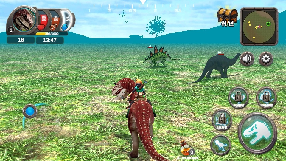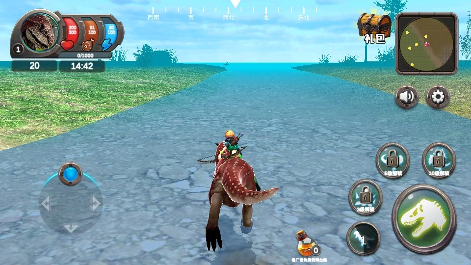 游戏内通过左侧的虚拟摇杆来控制角色的移动方向,你可以在广阔的史前场景中进行探索,去寻找恐龙的踪迹,与此同时要留意界面上方显示的状态信息,以便随时了解自身的情况。