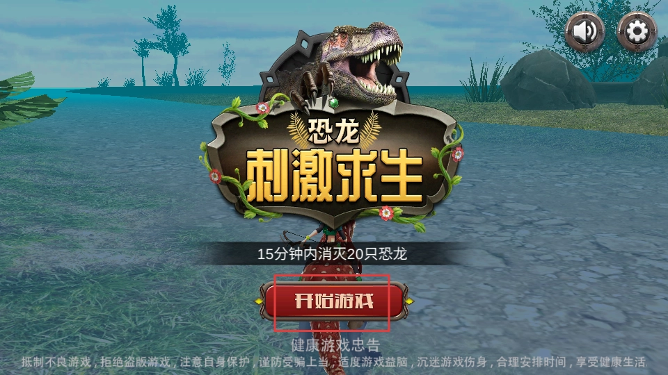 进入游戏前,点击“开始游戏”按钮,就能开启侏罗纪时代的生存挑战,目标是在15分钟内消灭20只恐龙,开启一场刺激的求生之旅。
