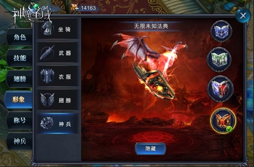 每个职业都能拥有一件神兵,召唤师的神兵外观与天书相近,从1阶到5阶的名称依次为“禁忌”“镇魂诗”“真理之门”“深渊导言书”“无限未知法典”。
