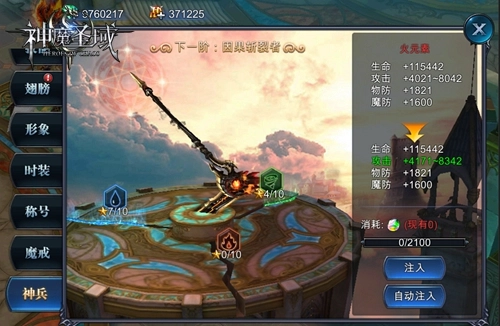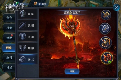 装备神兵后,角色界面会对应显示神兵装备图标;装备第一阶神兵后,可激活神兵界面,人物界面也会出现神兵菜单。获得神兵后还能进行培养,培养可提升神兵等级,获取更多属性加成;神兵有多种外形可选,通常越是霸气的神兵,属性值也越高。