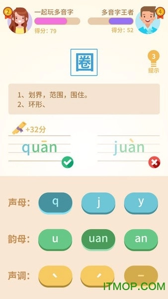 这是一款根据汉字识别读音的游戏,玩家只要对目标汉字给出正确读音就能通关,还能和好友一同PK,三千多个多音字,你认识多少呢?快来挑战看看吧!