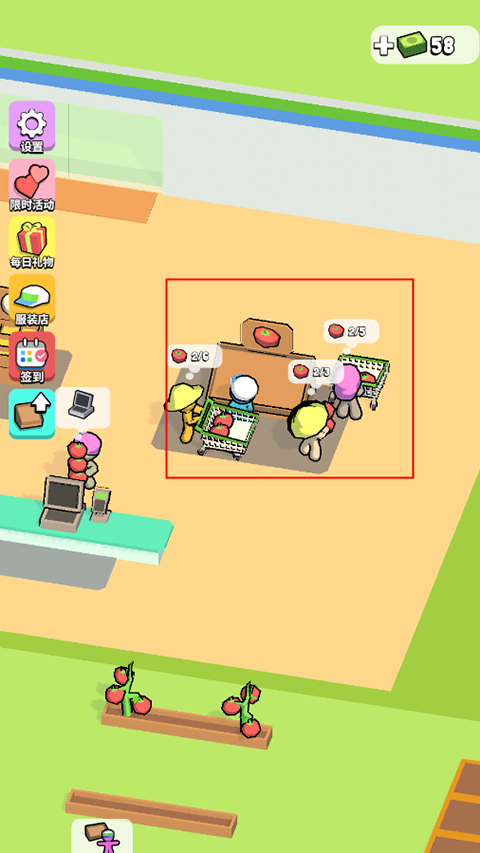 3.此时购物者买到东西后会在收银机处排队,玩家需要走到收银机前,把物品用箱子装好递给他们,就能获得相应的金币。