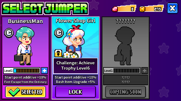 无限跳跃运用了怀旧的像素风格画面,带来复古又新鲜的体验。游戏包含15个以上的可爱角色,每个角色都独具特色,让玩家能进行个性化挑选。在冒险过程中收集硬币、解锁新角色,提升了游戏的探索乐趣。