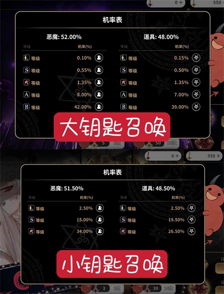 4、抽卡系统分为大钥匙召唤和小钥匙召唤。大钥匙召唤是免费的,而小钥匙召唤需要氪金。抽卡可以获得角色和道具。角色的稀有度从高到低排序为:L、S、A+、A、B。L级别的角色就是四位主角啦!道具可以为角色提供增益效果,稀有度和角色一样。小钥匙召唤保底获得稀有度A+角色和道具,且获得几率更高。