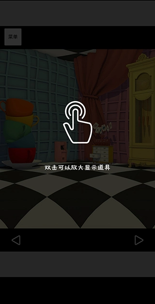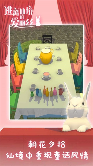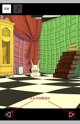 开局画面切换两次视角,中间出现戴绿帽子的角色。用锤子敲碎桌上玻璃罩获取胡萝卜,将其放置在开局画面左侧桌子的空盘里。返回粉色房间,翻开左侧椅子上的书得到操作顺序,回到开局画面对应位置开启墙上机关,获得蓝色怀表。在桌子下方闪光处找到茶壶币,投入游戏机玩游戏赢得变小药水。将药水对开局画面右侧中间的大兔子使用,点击窗帘下方并掀开窗帘后离开。按照开局画面里杯子的颜色顺序点击路牌,前往茶会。