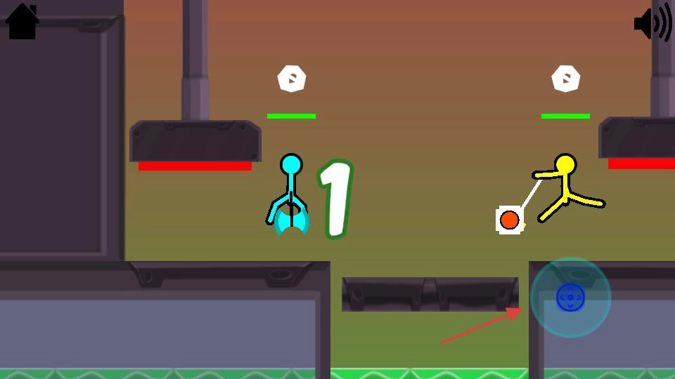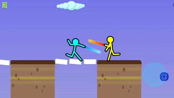 进入游戏场景后,操控蓝色火柴人,借助右侧的虚拟按键来控制它的移动与攻击,同时避开另一个火柴人的攻击,力求在关卡中获胜以推进游戏进程。