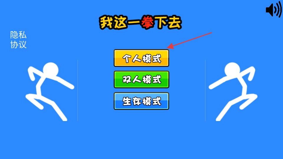 进入佳作主界面后,蓝色背景上显示着“我这一拳下去”的标题,接着点击个人模式按钮,选择单人挑战的游戏模式。