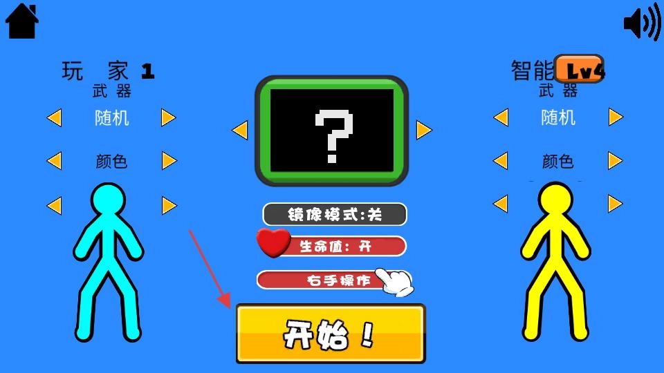 跳转到对战设置界面,能对玩家1和智能对手的武器、颜色等参数进行调整,确认无误后点击开始按钮,即可进入战斗加载环节。