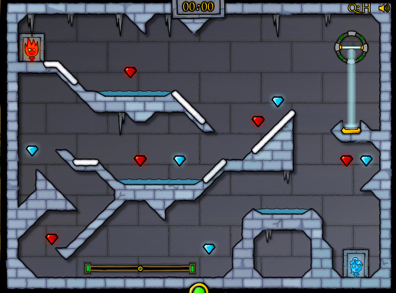 控制与液体同色的角色推动石块,在液体中铺路,让另一个冰火人通过。