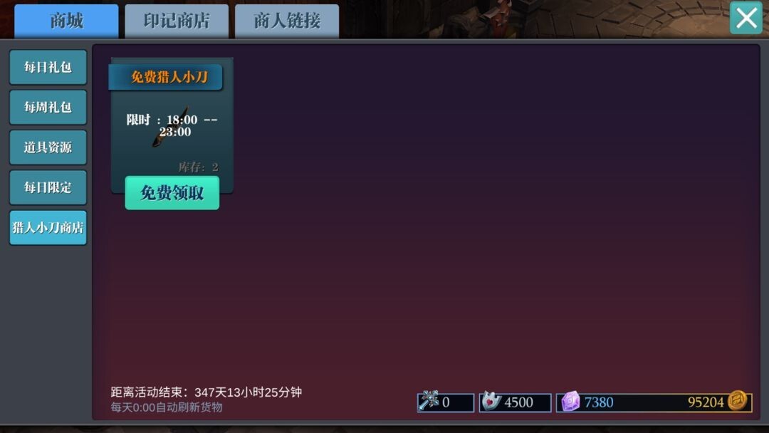 与此同时,商店中还有各类免费礼包等您来领取,只要点开商店,就能看到免费的每日礼包与每周礼包。另外,每天18:00至23:00 ,还能免费领取猎人小刀,过期可就没机会啦,千万别忘了!