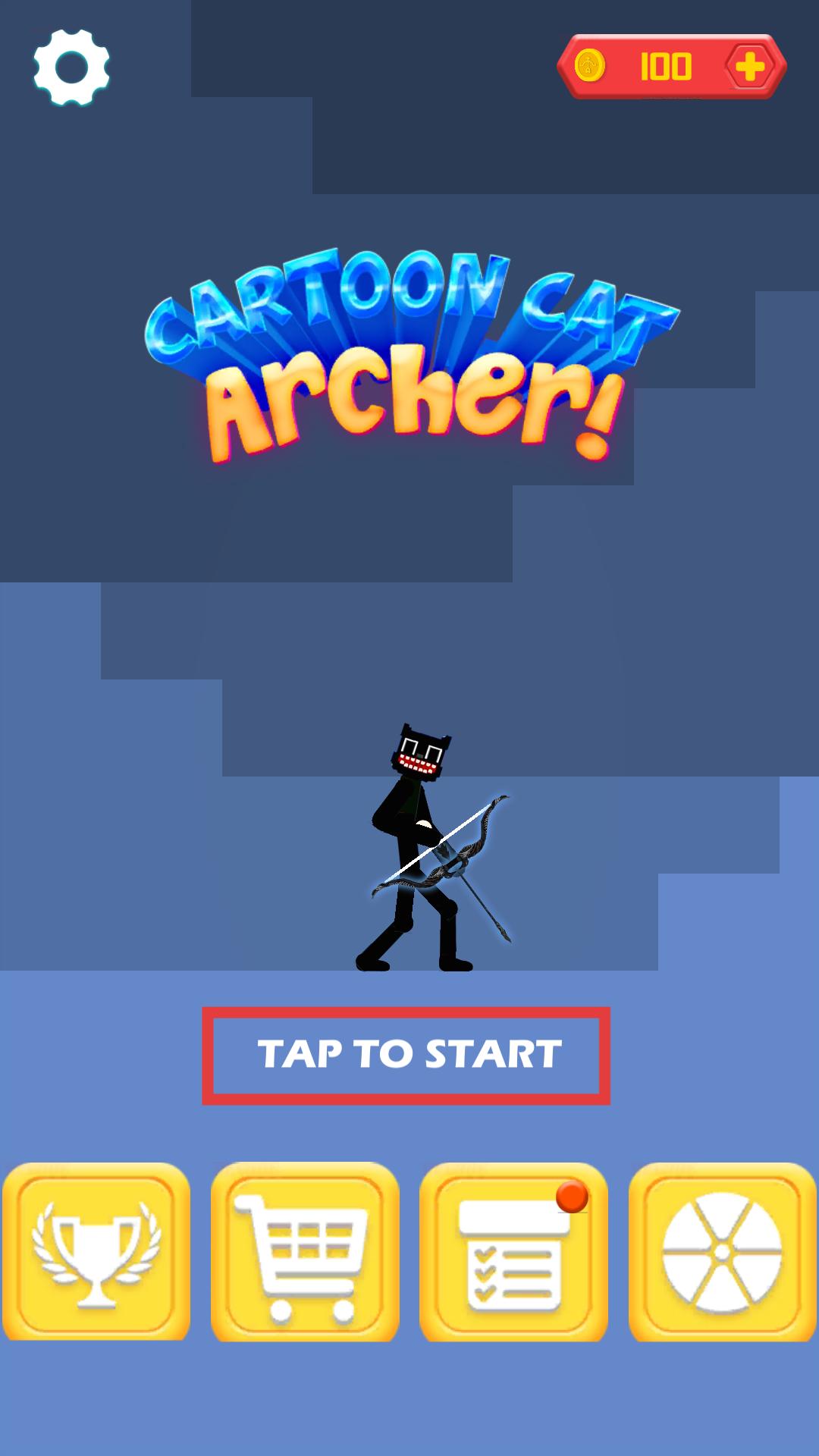 点击“TAP TO START”即可开启游戏,你将操控一只卡通猫弓箭手。游戏初始阶段,你可以查看界面下方的功能按钮,借此了解奖杯、商店等系统内容,为接下来的战斗做好准备。