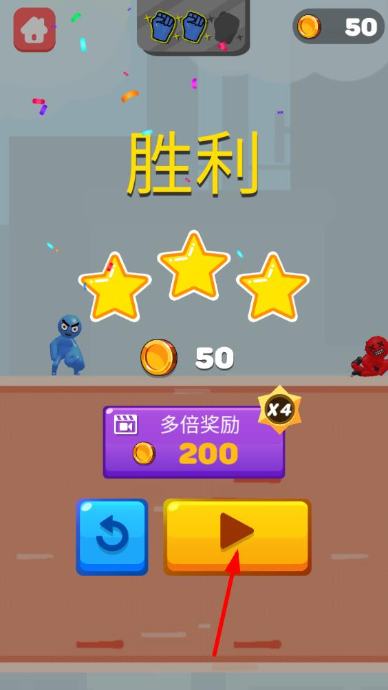 2、拳头飞行期间,能再次滑动屏幕来调整转向,借助反弹等手段击中隐蔽位置的小人。把所有目标消灭后就能通关,同时记得收集关卡里的奖励道具。