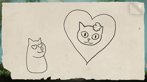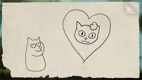在这里我们能够看到游戏的剧情,从简笔画中可以了解到,这里的狗狗需要翻山越岭去向猫猫求爱。