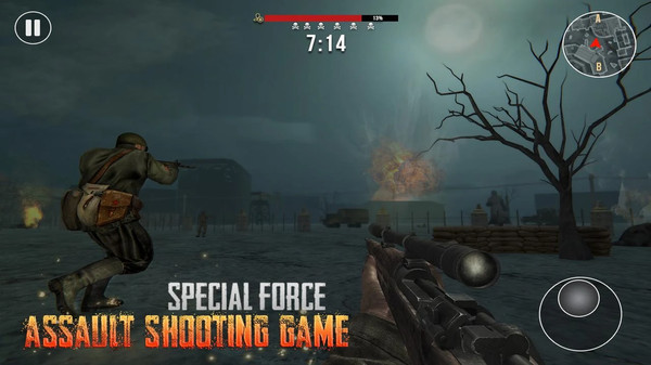 在游戏里,以二战时期现代军队的英雄为目标,在顶尖战略行动战争游戏中夺取胜利。借助战略打击与一流FPS军事战术,深入历史上世界大战的核心区域。在指定区域内灵活运用最优作战策略来对抗敌军。把握每一个时机,利用手中的枪械,在这款刺激的FPS游戏里消灭敌方车队狙击手和士兵。