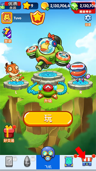 接着打开游戏,完成基础关卡的游玩后,等左侧出现返回按钮就能回到主界面。人物的左右两边是所携带的宠物,你可以点击它们来解锁和装备,还能够对宠物进行升级操作。