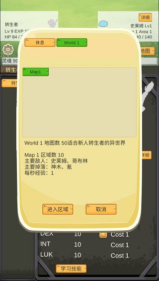 有了转生者后,你能在屏下左侧栏查看其能力,之后将他分配到异世界。点击屏幕右下角的“选择地图”按钮,然后选择World1和Map1。