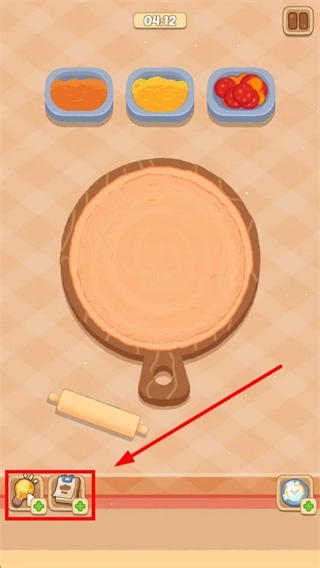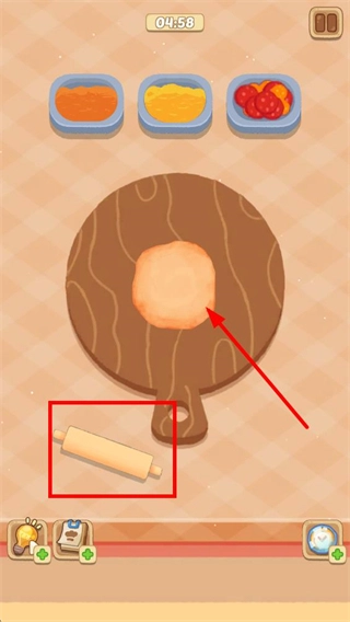 2、在制作页面,点击面团旁的擀面杖工具,将面团擀成披萨饼底。
