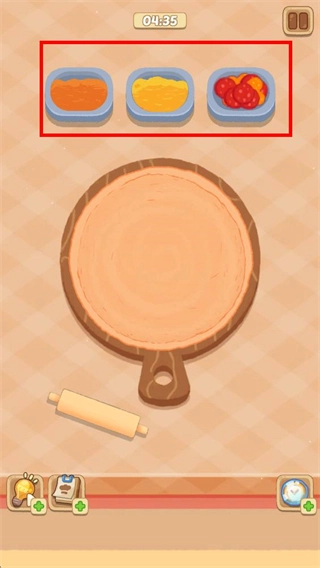 3、饼底擀好后,依次点击上方的酱料、芝士、配料等食材,将其添加到饼底上,完成披萨的配料铺设。
