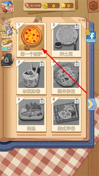 1、进入游戏后,在菜品列表中选择第一个披萨,进入制作界面。