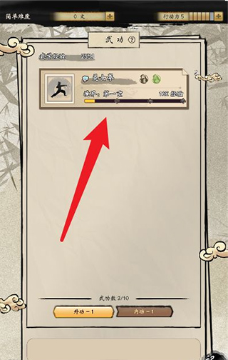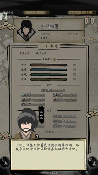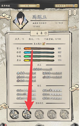 开局练功时,由于属性越高练功收益越低,所以四项属性需均衡练习。其中根骨和体魄可以适当偏高一些,因为早期武功对臂力和身法的加成较高。获得的白色最基础武功学会后保持0级暂不修炼,在18岁结束前直接将其学满。因为18岁结束后会安排一场战斗训练,想要获胜就必须修炼武功。19岁时只需专注练习四项属性中最低的那一项,之后闯荡江湖就不再需要专门练功了。