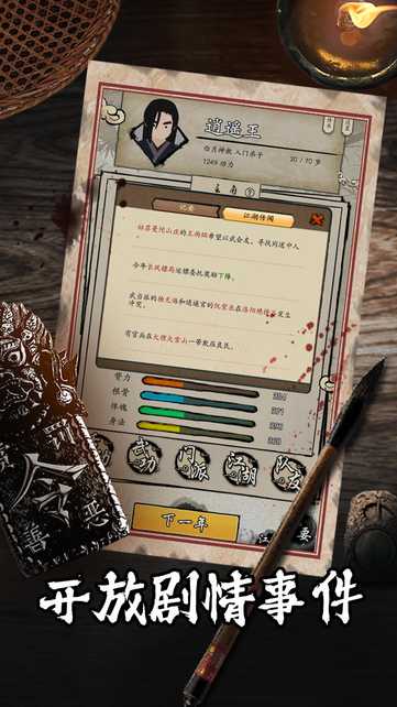 除了拥有充实的主线剧情与寿命设定外,游戏还会依据你做出的每一个选择,触发带有随机性的剧情事件,使你的武侠人生呈现出独一无二的特质。
