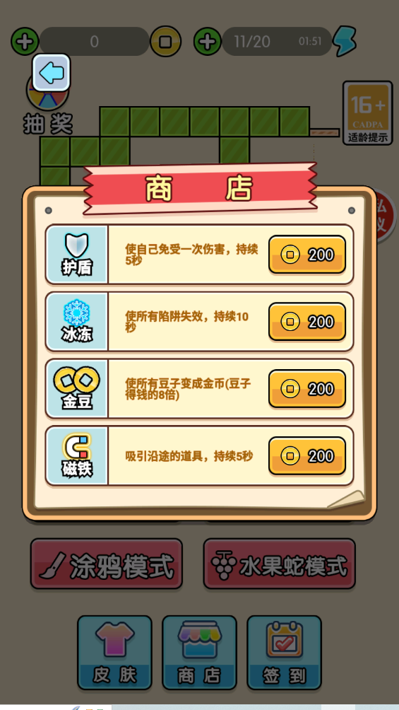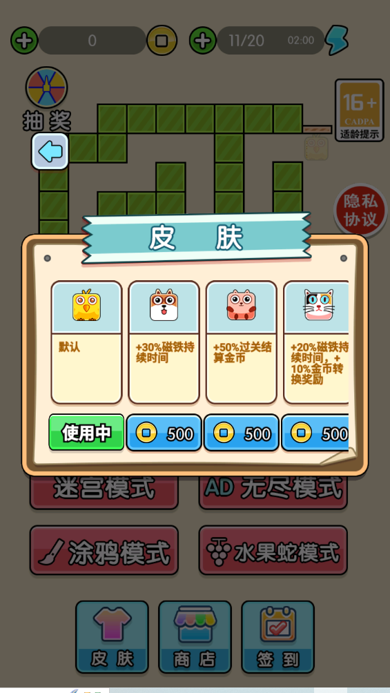 点击皮肤界面,你还能用金币购买超级可爱的皮肤来装扮小蛇。