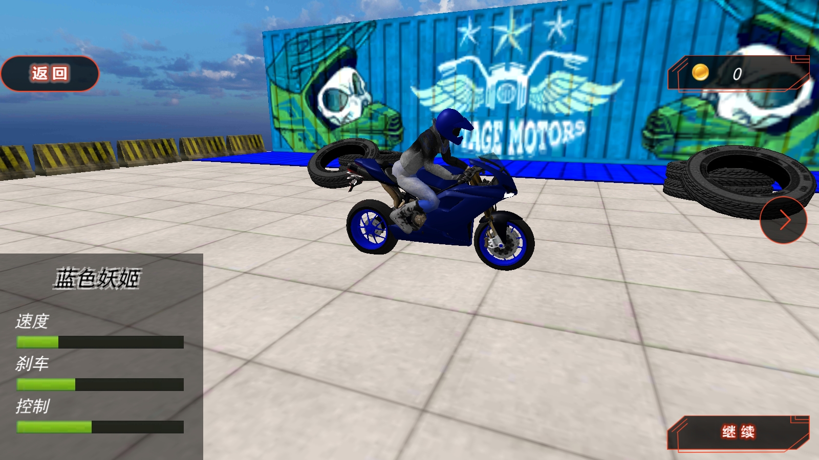 游戏会显示你的摩托车速度、刹车以及操控情况,点击继续即可。