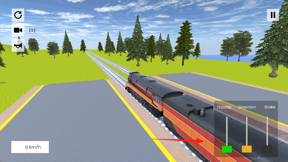 在车站场景中,操作右侧的绿色Throttle节流阀杆,向前推动以提升动力,火车便会从静止状态(0km/h)加速至88km/h并启动,随后沿着轨道行驶。