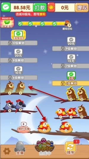 2、召唤更多小鸟不断完成合成,放置完成关卡挑战,使用各种金币购买各种道具帮助玩家提升小鸟等级。