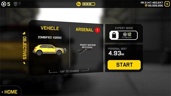 点击后可以挑选不同的车辆与武器来闯关,点击start即可正式开启。