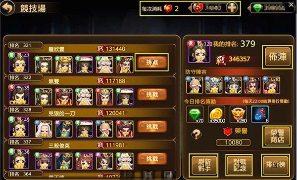 不同的对手都能发起挑战,挑战排名越靠前的玩家(比如排名321),一旦成功,你的排名就会自动上升到该玩家的位置(即排名321)。而且,每当首次突破自己的历史最高排名时,都能获得丰厚的钻石奖励。所以,不妨集中所有实力,一鼓作气冲击更高名次吧!