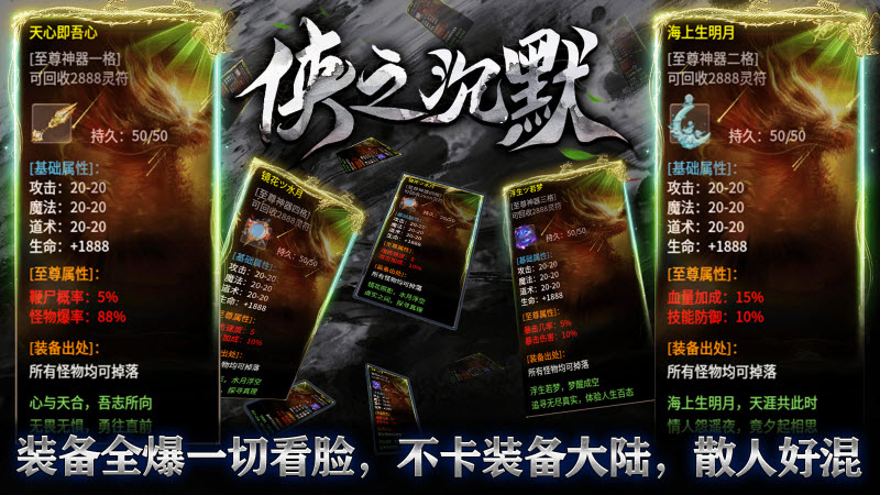 3、本服内4大至尊神器,6大追梦神器,全服所有怪物均有几率掉落,属性强大。
