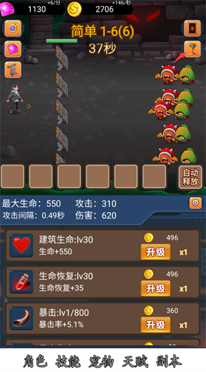 这是一款挂机类游戏,玩家只需通过挂机就能消灭怪物,而且每成功消灭一波怪物,都能获取相应的金币奖励。