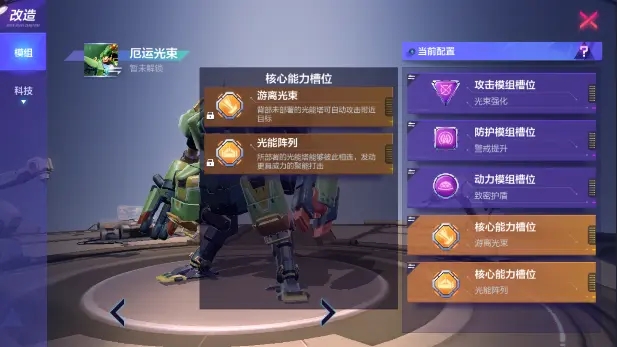 核心模组1的效果是核心游离光束,当背部的光能塔处于未部署状态时,它会自动获得攻击能力。这个游离光束模组的泛用性相当出色,只要保留一个未部署的光能塔,就能让它自动进行攻击。