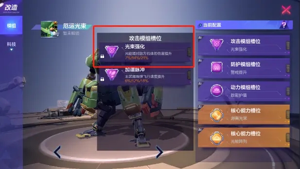 攻击模组方面,建议选择光束强化。这是初始就有的模组,核心效果是增加光能塔的伤害输出。到了决赛圈阶段,副武器的重要性会变得十分突出。